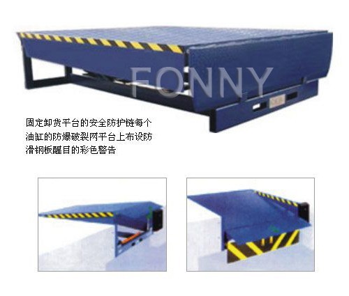 固定式液壓登車橋是實(shí)現(xiàn)貨物快速裝卸的專用輔助設(shè)備,它的高度調(diào)節(jié)功能使貨車與庫(kù)房的貨臺(tái)之間架起一座橋梁,叉車等搬運(yùn)車輛通過(guò)它能直接駛?cè)胴涇噧?nèi)部進(jìn)行貨物的批量裝卸,僅需單人作業(yè),即可實(shí)現(xiàn)貨物的快速裝卸。